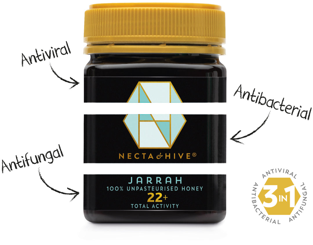 Jarrah Honey gets its antimicrobial properties mainly from hydrogen peroxide, produced by an enzyme called glucose oxidase. Jarrah honey is graded by its Total Activity (TA) score, which measures the sum of all its antimicrobial factors